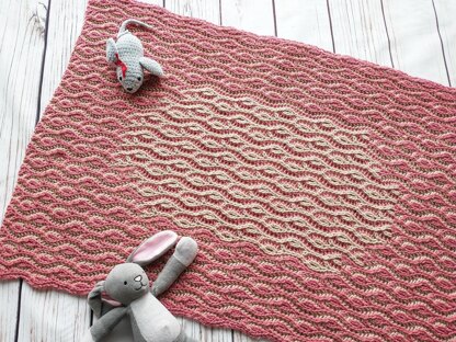 ConstructionThe blanket has a rectangle shape worked in a two-colored, syncopated brioche with a leafy pattern. It starts with a two-colored tubular cast-on. First repeats are worked in a two-colored brioche, then in the middle of the row syncopated brioche is introduced and expanded to add an oval-shaped contrast color pattern in the middle of the blanket. Towards the top of the blanket syncopated brioche is slowly reduced and the blanket is finished as it started - in a two-colored leafy pattern, ending with tubular bind-off.