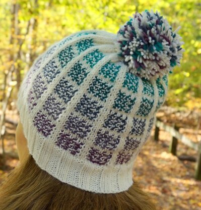 The Anning Hat uses mosaic knitting to create a colorful pattern of woven squares. This hat is named after Mary Anning, who excavated the first Ichthyosaurus skeleton in Lyme Regis, England when she was eleven years old, and then went on to become a self-taught paleontologist.