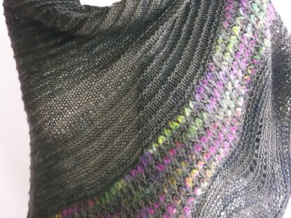 This top down half circle shawl has curved garter ridges through the main body, leading into a simple two colour brioche stitch pattern. The border is a wonky wavy border that is finished with an i-cord bind off.