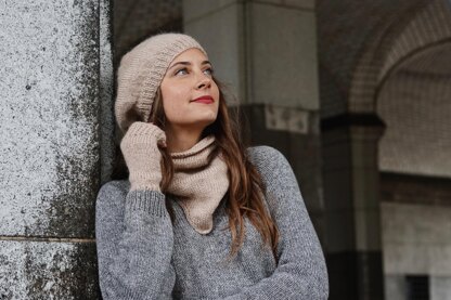 Bring out your inner Parisienne in this charming set featuring a beret, triangle kerchief, and fingerless wristlet gloves. Made in a weightless, airy mohair blend, these accessories feel light as air, soft, and feminine all at once. With mirrored centered decreases and an i-cord top loop, the beret has a classic and clean look. The kerchief can be worn either with the point in front or rolled and tied in front.