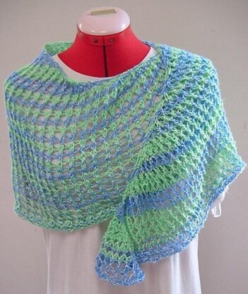 It is a top-down, symmetrical crescent shawl. The design consists of k2tog, ssk and yo and increases on both sides. You can make it bigger by working more repeats. Any yarn and colour will be great for it. Gauge is not important.