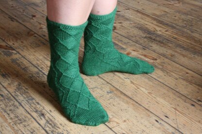 The city of Antwerp has a long association with diamonds. Most of the world's rough diamonds pass through there before being transformed into something beautiful. This top-down sock features a cascade of diamonds down the front and individual diamonds on the side in a sea of seed stitch.