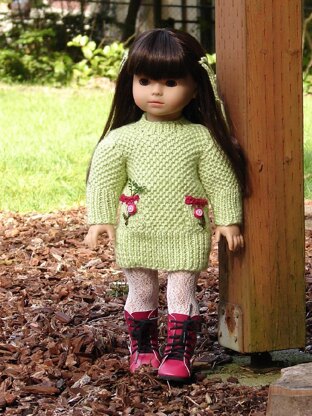 “After receiving several requests to design an American Girl version of [‘Nuala’][2], a sweater dress pattern I had created for the slim 18" Kidz ‘n’ Cats dolls, and seeing my 18” Gotz girls anxiously awaiting spring’s arrival prompted this version. Anyah: English: meaning Gracious, befitting of the delicate spring blossoms now arriving in my garden.” ~ Deb