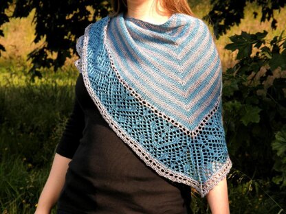 Aoide was the Ancient Greek titan muse of song and this shawl will make your heart and needles sing. It is a stunning heart-shaped shawl, worked top down in stripey stockinette with a gorgeous lace border and eyelet edging.