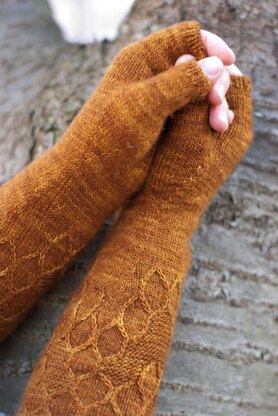 These mitts were designed to match the Apis Dorsata shawl/scarf pattern. The honeycomb pattern is created by using slipped stitches and is accented with garter stitch sections.