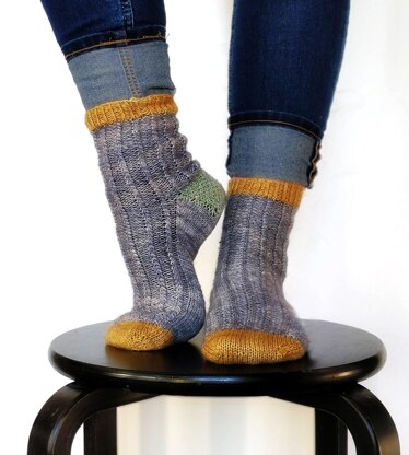 Apollo socks are classic ribbed socks with twisting columns that remind me of laurel wreaths – the symbol of the ancient Greek and Roman god Apollo. The simple mock cable pattern is surprisingly easy and suitable even for beginners. The socks also have a beautifully detailed Eye of the Partridge Stitch heel flap and a round French heel. While the socks were originally designed for a three-color sock kit from Gregoria Fibres, you can just as well knit the socks in just one color or add a pop of color to the cuff, heel and toes with leftover sock yarn in a contrasting color.