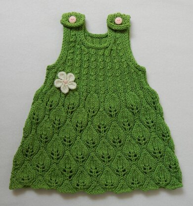 Questions on the instructions? Contact me here on Ravelry, or email me at woolybearhandknits@yahoo.com. A summer sun dress for your little darling! The twisted rib stretchy bodice gently flares into the lacy leaf skirt. Buttons on the shoulders make it easy to put on over baby’s head. Armholes and neck are edged with comfortable I-cord that is created as you knit the bodice (not attached later). Add a pretty knitted Apple Blossom at the waist.