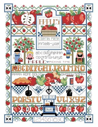 Designed by: Linda Gillum. What a delicious and crisp cross stitch project! Apples of all kinds, alphabets galore and sweet kitchen details all make for a fun stitch by designer Linda Gillum. Any way you slice it, this classic country sampler is colorful and the perfect design to add rustic farmhouse charm to your home!\n