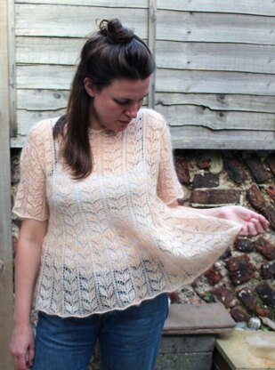 Apricot Float is a delicate lace top, lighter and daintier than the froth of a summer cocktail, with a simple but beautiful motif. Doubling the stitches at the waist creates movement and shape down to the hips, and short sleeves give the top a summery cool wearability. The garment is knit top down, in the round; sleeves are then picked up and knit in the round. The I-cord cast off gives the edging weight and structure.