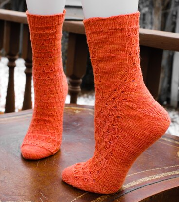 Spring is in the air! Imagine a café au lait at an outdoor café on the bank of the Seine, and then walking along the Champs de Mars toward the Eiffel Tower. Worked in a beautiful light weight yarn and a gorgeous spring colour, April in Paris is a toe-up pattern that features Eiffel Towers on the foot and leg of the sock. Two of the Eiffel Tower pan-els then break off and meander up the back of the leg and meet at the cuff. Pattern instructions are given for narrow width with instructions for other sizes in parentheses. If there are no parentheses the instruction applies to all sizes.