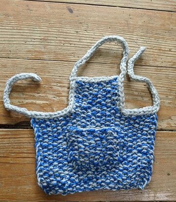 Just in time for baking season, to dress up any of your dolls or toys while they are helping in the kitchen. This apron fits dolls from 9" and up. The apron will also fit smaller size dolls as well. The Apron is 5" (13 cm) wide and 5.5" (14 cm) tall. Suggested yarn: Worsted weight: You will need less than 50 yards /46 meters of MC and 15 yards / 14 meters of CC. The Apron is knit flat, with I-cord edge and string. The pocket is knit separately and sewn on. Pictured are two knitted toys wearing the apron: Frances and Baba Yaga. Knitting pattern for Frances is available to purchase and the knitting pattern for Baba Yaga will be available in December 2020