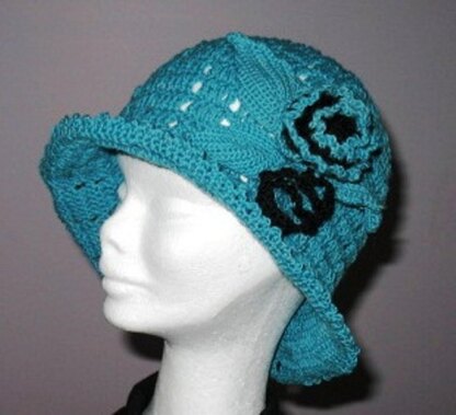 This crochet Aqua Brim Hat is decorated with two gorgeous rose flowers and three curly leaves. The big rose has the matching aqua color trimmed with black color, while the small black rose is trimmed with aqua edge.