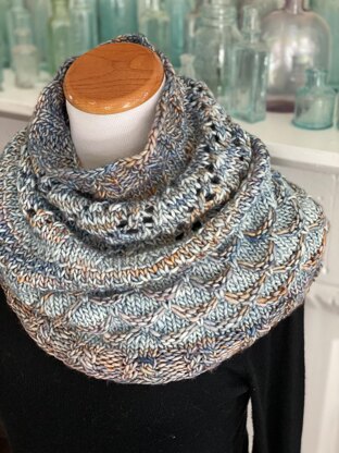Aquinnah is a town on the island of Martha’s Vineyard. Clay cliffs melt into sandy beaches spotted with smooth stones worn by the sea. Waves roll in with frothy white caps, seemingly for miles. The colors and stitches of Aquinnah Cowl aim to capture this special place.