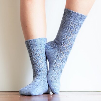 As elegant as a night at the ballet, the Arabesque Socks epitomise fancy footwear. These socks feature a delicate lace motif which runs the length of the foot and leg, with mock cable detailing on the cuff (and heel if you choose to knit your socks with a heel flap and gusset).
