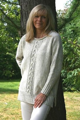 Aral is a casual oversized pullover. It features pretty cables on front and back and little cable running along the sleeves. It is knitted sideways with dolman sleeves and minimal shaping. A perfect every day use garment for the autumn/winter season.