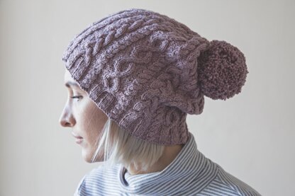The unisex bobble hat patterns comes in two sizes: one for average man's size axnd one for average woman's size. Knitted in Rowan Softyak DK in either pink (Steppe 231) or Lawn 241), with a repeating design of three different Aran style-cbles, the hat has an extra long length and generous bobble to finish.