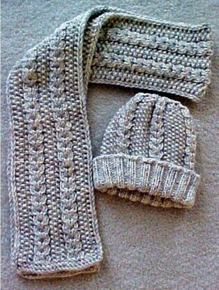 Some aran patterns take are difficult and take forever. Not this one. This is a simple repeat pattern, and a good pattern to try if you have never done aran knitting before. To make it easier, we made this with bulky yarns, and knitting needles US # 9 and # 10.5, so work goes faster, with fewer rows. You will need a 16 circular needle # 9, and a few double points to do last few rounds of decreasing on hat. Dont worry, we did not give you too many decrease rows. Scarf is about 59 inches long, but you can knit it shorter, if desired. Hat is one size fits most.