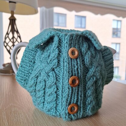 The advanced knitting pattern includes 16 pages of detailed step-by-step instructions accompanied by pictures on how to knit Aran jacket tea cosy for 6 cups.