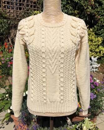 A very pretty design with aran style cabled panels set against a background of reverse stocking stitch. The sleeves and sides of the main part are worked in rice stitch. The leaf motifs are worked separately and arranged each side of the larger cables. However you can stitch them where you wish, or leave them off the sweater altogether, as this is a lovely aran sweater without them too. Worked bottom up and with full written instructions.