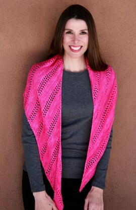 Yarn used for shawl shown: Leading Men Fiber Arts, Show Stealer, 80% superwash merino/10% cashmere/10% nylon (435 yards/100 g), in color My Lip Gloss Be Poppin! (1 skein)