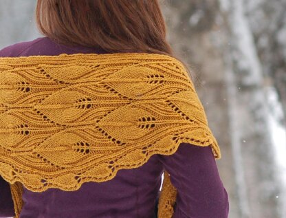 It comes in two sizes: * 161.5x35.5cm / 63½x14", which can be worn as shawlette or wrapped around the neck like a scarf. This size is shown in the main pictures, worked in PDS Worsted in shade Tupelo Honey. * 217.5x41cm / 85½x16¼" for a nice size shawlette.