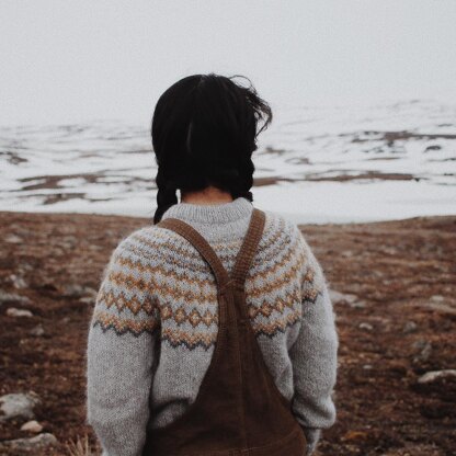 This boxy top-down jumper is knitted in the round and features a seamless construction and stranded yoke. It comes in ten adult sizes with customization options for body length, sleeve length, and bust shaping.