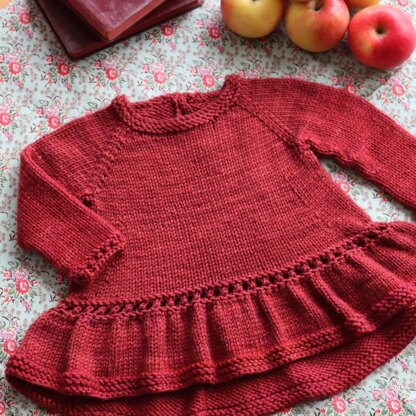 The yoke of this dress is worked seamlessly from the top down, first flat with some short row shaping, then in the round until underarm level. The sleeves are then separated from the body, which is worked in one piece to the hem, featuring a dropped waist and a hi-low skirt shaped by short rows (link to video tutorial provided). The sleeve stitches are returned to the needles and worked in the round (4 sleeve length options are suggested). Stitches are picked up around the back neck opening to work the button loop closure. Alternatively two ribbons can be sewn to the neckline edges.