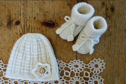 A little set for babies, a textured hat and booties with tab ties and optional knitted flower.