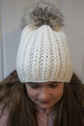 The Ariel hat is knitted in the wheat ear loop st. This stitch gives both a cable and ribbing effect.