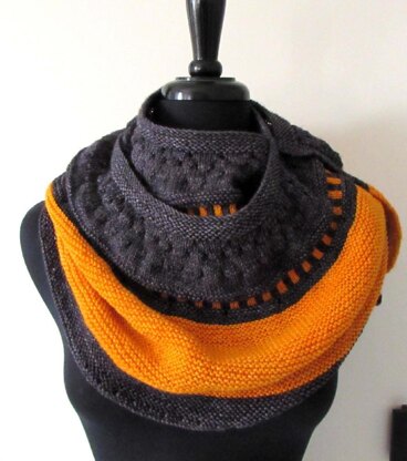 This long curved shawl or wrap features a section of lace, a band of vertical stripes and loads of garter stitch. The lace portion reminds me of twinkling stars at night giving way to the Sun's bright rays in the morning, represented by the vertical stripes.