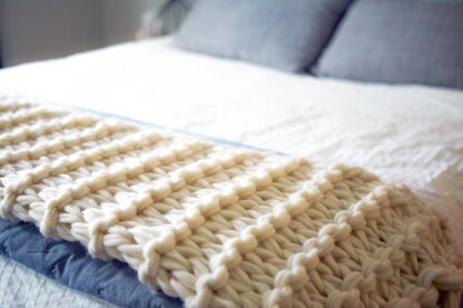 Wrap yourself up in this gorgeous, chunky knit throw! This garter stitch blanket pattern teaches you how to arm knit AND make this beautiful blanket in no time! The blanket is thick and luscious and will make the perfect luxury accent to your decor. The finished blanket measures 54" x 42". The pattern suggests 8 skeins of gorgeous Cascade Magnum 100% Peruvian Wool 123 yards each.