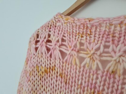 We cast on stitches at the shoulders and work down the upper back working short rows at the shoulders and armhole shaping, as well as knitting a gorgeous lace design as we go. Stitches are picked up at each shoulder for the fronts where we work armhole shaping to match the back, then we join all stitches at the underarms and work down to the hem. Increases are worked at the inner edge of both fronts for a little extra cosiness! We pick up stitches around both armholes and work sleeves down to the cuffs, working just a little more lace on the way.