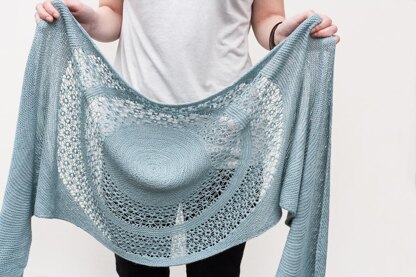 One of Shetland’s most impressive lace patterns, Bird’s Eye Lace, is showcased in the concentric circles at the centre of this modern garter stitch shawl. Surrounded and framed by garter ridges, this lace pattern doesn’t need elaborate blocking to shine! Pompoms add a playful touch to each of the shawl’s tips and the soft, refined shades of Wollmeise Lace turn it into a wonderful accessory.