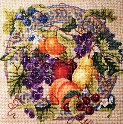 Designed by: Barbara Baatz Hillman. Our Fruit and Berry Wreath is a celebration of the harvest and autumn colors! A thicket of berries is scattered among rich red apples, golden pears, and grapes to welcome the season of thanks. Makes a truly unique gift for Thanksgiving, Halloween, weddings and housewarmings.
