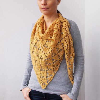 It’s in a slightly asymmetrical triangular shape. It’s fun play of triangles and lace which will show beautifully when worn. The asymmetrical shape and the geometric form of the pattern makes the contemporary look of the shawl. It can be worn in a multitude of ways. Wrap it around your neck as scarf, wear it like a cowl or bandanna, or just throw it over one shoulder to give a pop of color.