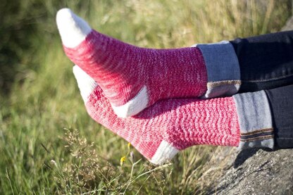 Arrowhead provides simple texture stitch to add to your favorite sock pattern. The arrowhead texture is worked around the leg of the sock, and is continued down the top of the foot. Arrowhead features a slipped-stitch gusseted heel (substitute your heel of choice) and a rounded toe, both worked in a contrasting color.