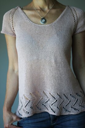 Arrows is an airy, light, quick to work tee that basically knits itself! This raglan tee is worked top down so you can try it on as you go and once you are done, there is very little finishing required.