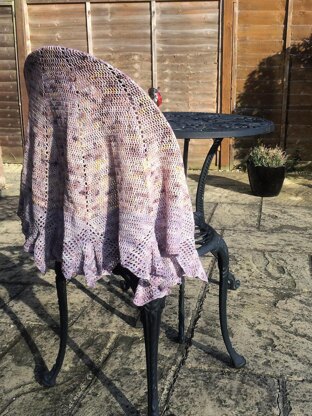 I have had the shape of this shawl (a bit like a half hexagon) in my head for a long time but couldn’t quite figure out how to do it. When I got this yarn for my last birthday I knew I had to work it out. I also wanted the border to have movement, without being really frilly and so the Artefact Shawl was born. It is made from the centre out and although it may look complicated the border is quite straightforward once you get going.