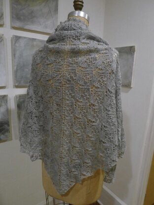 This sheer triangle shawl in two sizes (petite/tall) features an allover pattern of repeating shapes that resemble the artichoke plant and fruit. The pattern can be adapted to any yarn weight by using an appropriate needle size, and knit to any desired dimension. Lace knitting on both sides of the fabric produces crisp lines and large eyelets with a deeply scalloped hem. Substituting yarn and/or needles will result in an overall variation in size.