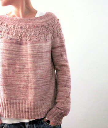 Arwen is a round-yoked sweater that is worked seamlessly from the top down. After finishing the neck ribbing some short-rows are worked back and forth to create a higher back neck and then the round-yoke is worked top down with a cute ‘bobbly’ lace pattern band to sleeve separation. Sleeve stitches are placed on hold to work the body top down to the long 2x2 Rib with a light A-line shaping. Sleeve stitches are then picked up again to work the sleeves top down in rounds to the 2x2 Rib cuffs.