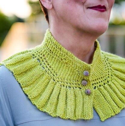 Add a Victorian flair or a Steampunk edge to your outfit with this deceptively easy-to-knit collar, shawlette, or shawl. The tiny bit of sparkle in the yarn gives it a special touch, without being too much.
