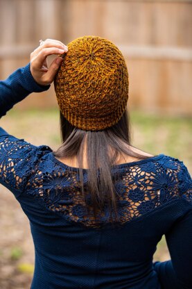 Aslyn is a fun-to-knit and easy-to-wear hat featuring beautifully simple textures that together have a dramatic effect. The hemmed, twisted rib brim transitions uninterrupted into a unique, allover lattice texture, which then blends organically into the crown shaping. This hat looks great in both variegated and solid colorways and worn either snug or slouchy!
