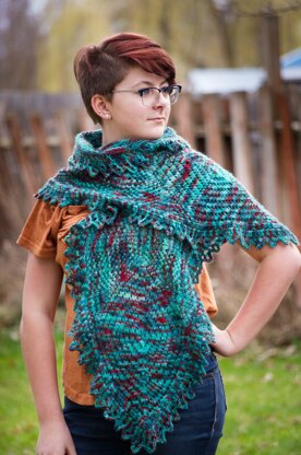 Aspasia is a simple geometric lace stole designed to work expertly with a variegated yarn and short color repeats. A combination of biased eyelets and mock cables are worked in an unusual rectangular shape in the round. The short ends are worked with a large increasing diagonal line pattern, and then decreased to a point back and forth after the main body of the shawl. Adorned with a simple border, this stole is wide enough to cover the shoulders and long enough to be wrapped around the neck twice.