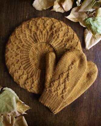 A cozy and classic tam and mittens set with a cabled detail reminiscent of aspen leaves across a soft purl background. Inspired by the glorious groves of aspen trees that transform their leaves every autumn, turning the eastern Sierra Nevada and high desert of Nevada a stunning gold. This classic yet modern set knits up beautifully in squishy and wooly DK yarn.