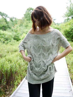 A dramatically textured, lightweight tunic or cropped pullover in five sizes (XS, S/M, L/1X, 2X/3X, 4X/5X) featuring a bold cable and lace motif with deep, embossed ribbing to finish the hem, sleeve cuffs, and wide neck. Worked in two simple rectangles with a bit of neck shaping, this drop-shoulder design has an easy, slouchy fit that goes from seaside fun to poolside cocktails without a hitch—a great weekender piece.