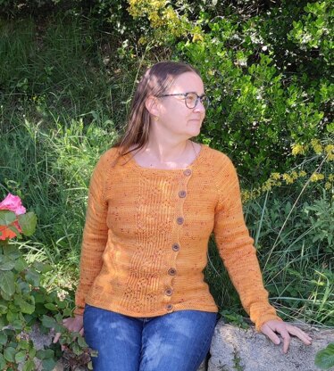 It is worked in DK yarn. I chose the Abri DK, in the colour Golden hour, a soft, luminous orange, perfect for bringing a little sunshine into this very changeable spring… You’ll need 925/975 (1025/1100/1150/1200/1250) metres. And 7 buttons.