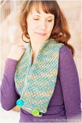 “Asteri” is a scarf designed for flexible wearing options. Wear it like a regular scarf ~ or use the button sets to turn Asteri into a cowl, a tie, to simply keep the edges together ~ or whatever you desire. The unique stitch pattern makes "Asteri" suitable for men and women, while looking great in hand painted, variegated, semi-solid or solid colorways.
