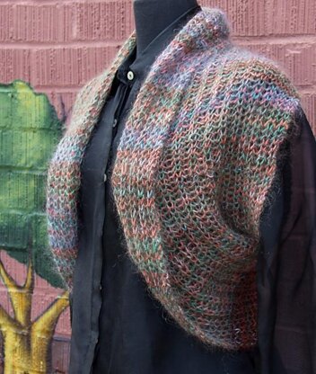 This shrug is my go-to garment when I want to ward winter chilliness! It is comfortable, light and easy to wear. Worked in a brioche rib stitch the fabric is reversible. There is no shaping in the knitting. The finished form is created by clever seaming!