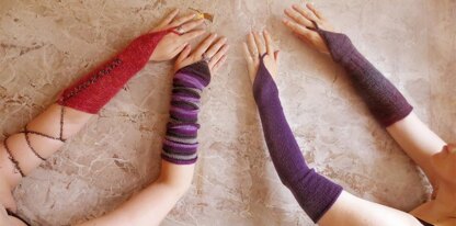 Finally, a DRESSY armwarmer! Whether you need to warm up an evening gown or wedding dress, you can both be warm and stylish. All the glam of an opera glove, while leaving your fingers free. Choose funky, steampunk, cos-play or casual, by scrunching down on a wrist or lacing up the arm with chain or ribbon. Construction: Fingertip up, knit first flat and then in round on DPNs. Variation Ami (A) includes 29 rows of simple vertical intarsia. Variation Bliss (D) includes eyelets and laces.
