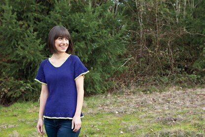 Atalanta is a top down raglan shirt knit in a soft cotton blend, perfect for spring. Atalanta was a princess in Greek mythology, strong and capable and fast of foot. This comfortable and practical garment, loose fitting, but with flattering dart shaping, strikes me as a sort of modern take on something a Greek huntress might wear. The simple lace edging adds a point of interest for the knitter, and creates something a little different than the usual tee shirt.